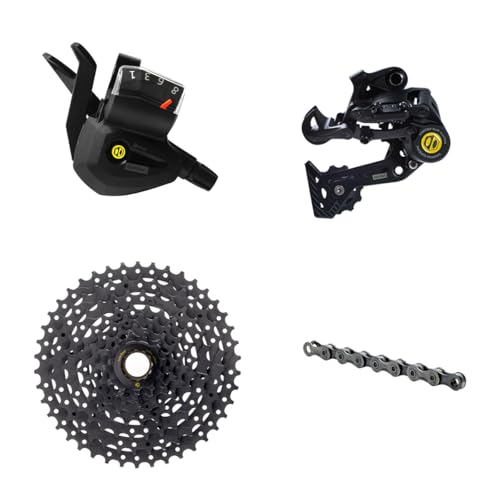 - ✅ INCLUDED COMPONENTS: Enhance your cycling game with the Complete Groupset Box Four 8 Speed single Shift Shifter, Wide Rear Derailleur, Cassettes are accessible at 12-42T and 116 Link Chain Natural. Seamless Bicycle Gear Shifter changes, impeccable durability, and a polished finish for the ultimate cycling experience.